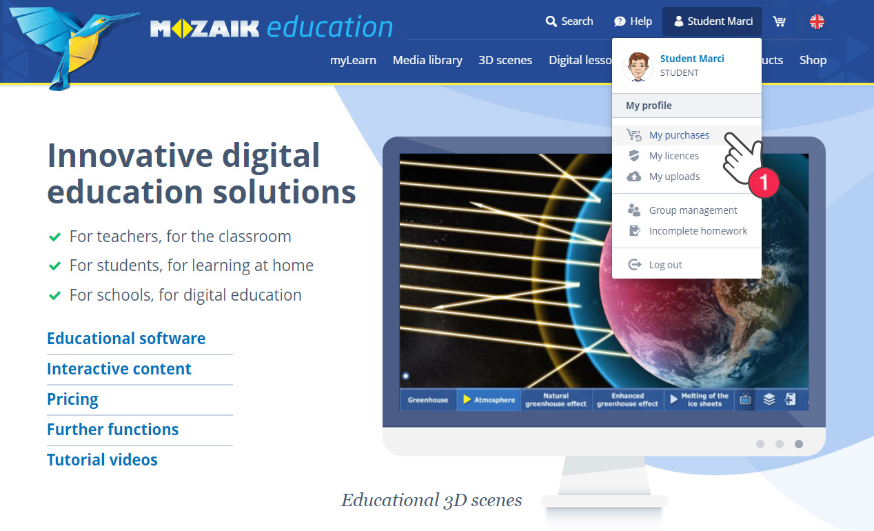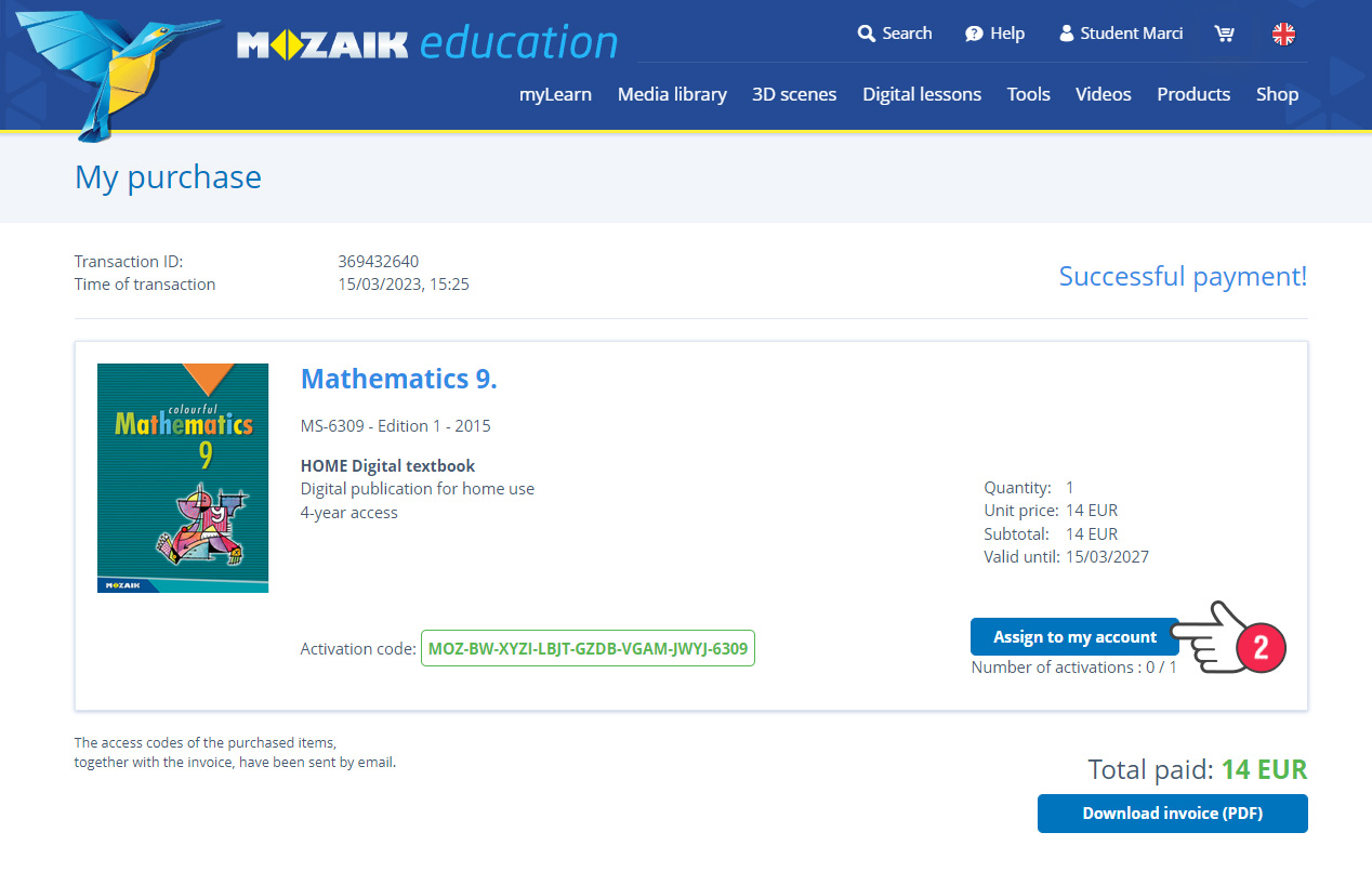 Voordat je de digitale publicaties kunt gebruiken, moeten ze geactiveerd worden. Dit betekent dat je het boek aan je mozaWeb-gebruikersaccount toewijst. Als je het boek voor jezelf hebt gekocht, kun je het na aankoop onmiddellijk aan je account toewijzen (2).