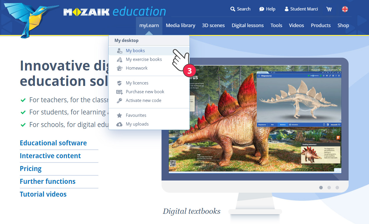 Je geactiveerde publicaties zijn te vinden vinden onder 'myLearn'/'Mijn boeken' (3).