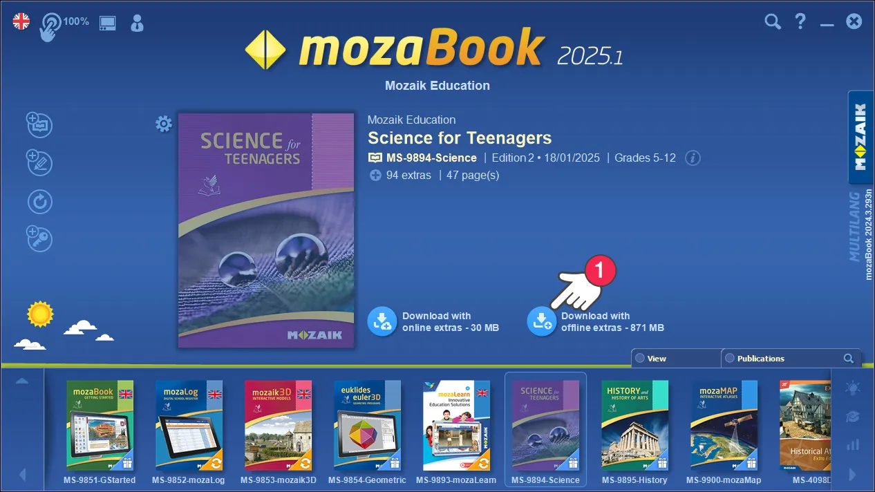 V mozaBooku- si môžete stiahnuť online a offline verziu kníh (1). Offline verzia si vždy vyžaduje väčší priestor na pevnom disku, ale po stiahnutí knihy budete môcť otvoriť a používať ich interaktívny obsah (3D scénky, videá, úlohy) bez aktívneho internetového pripojenia.
