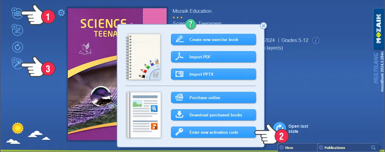 mozaBook出版物の選択画面で新しいパブリケーションを追加するアイコンをクリックし (1)、 その後 新しいアクティベーションコードを入力するボタンを選び、(2). あるいは アクティベーションコードを入力アイコンをすぐに選ぶことができます。(3).