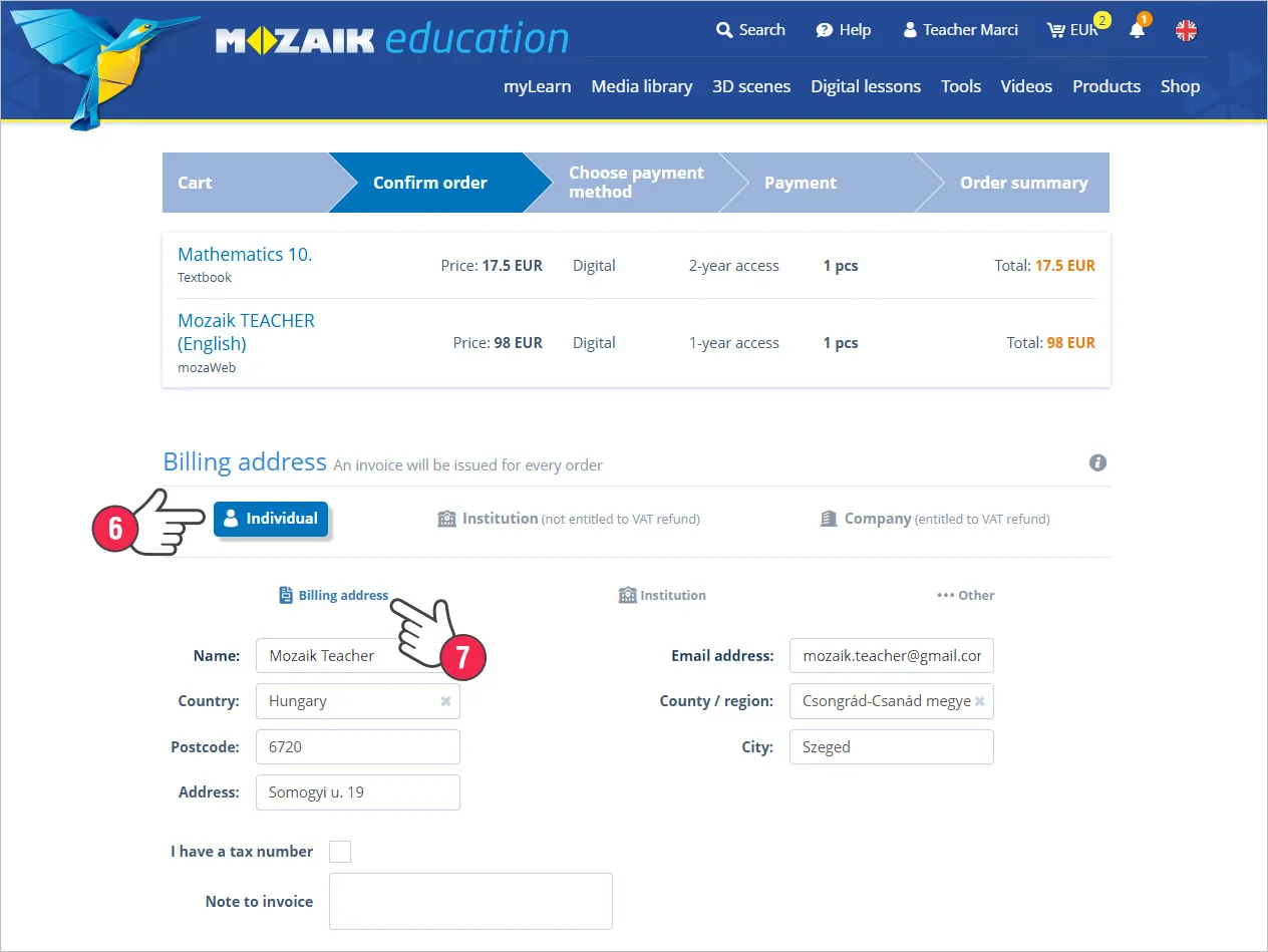 Luego, en la página de confirmación del pedido – si no has introducido esta información antes – tienes que declarar si realizas la compra como un individuo, en nombre de una empresa o una escuela (6) y debes introducir la Dirección de facturación (7).