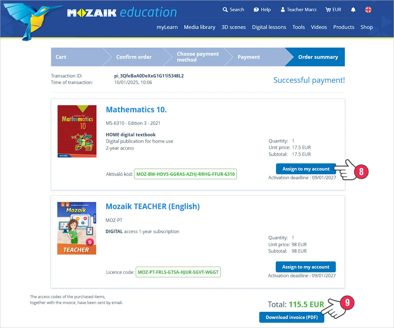 Si tu pago ha sido exitoso, serás redirigido a la página Mis pedidos dónde puedes ver tus productos comprados y los códigos de licencia o activación de estos indicados con el color verde. En esta página, puedes activar con un clic las publicaciones digitales y la suscripción de Mozaik Student / Teacher, así asignándolas a tu cuenta (8). La factura de estos productos es descargable desde aquí también (8).