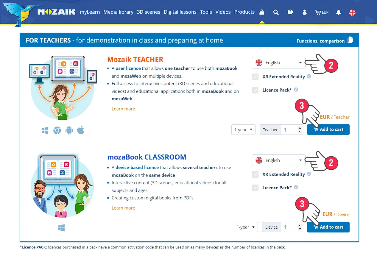 You can choose from several licence types on the mozaBook information page. Read what each licence type includes and choose the one that best suits your needs. Then select the language of the program (2) and add it to your cart (3). Read more about licence types here.