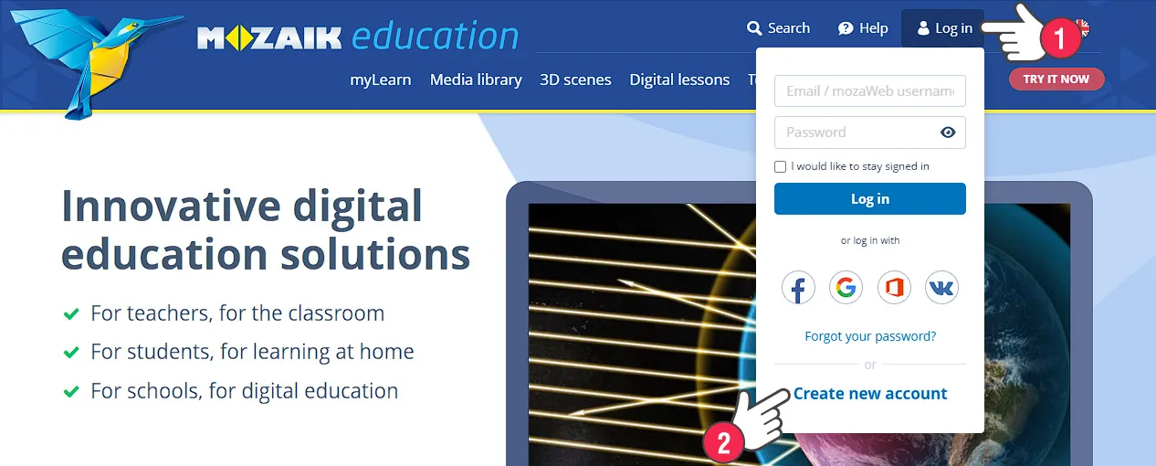 Open the login panel (1) on the page header and click on Create new account (2).