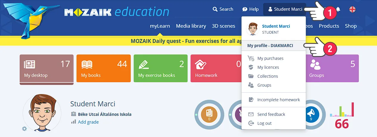 Ha bejelentkeztél a mozaWebre, akkor a nevedre (1) kattintva a legördülő menüből válaszd a Profilom (2) menüpontot: