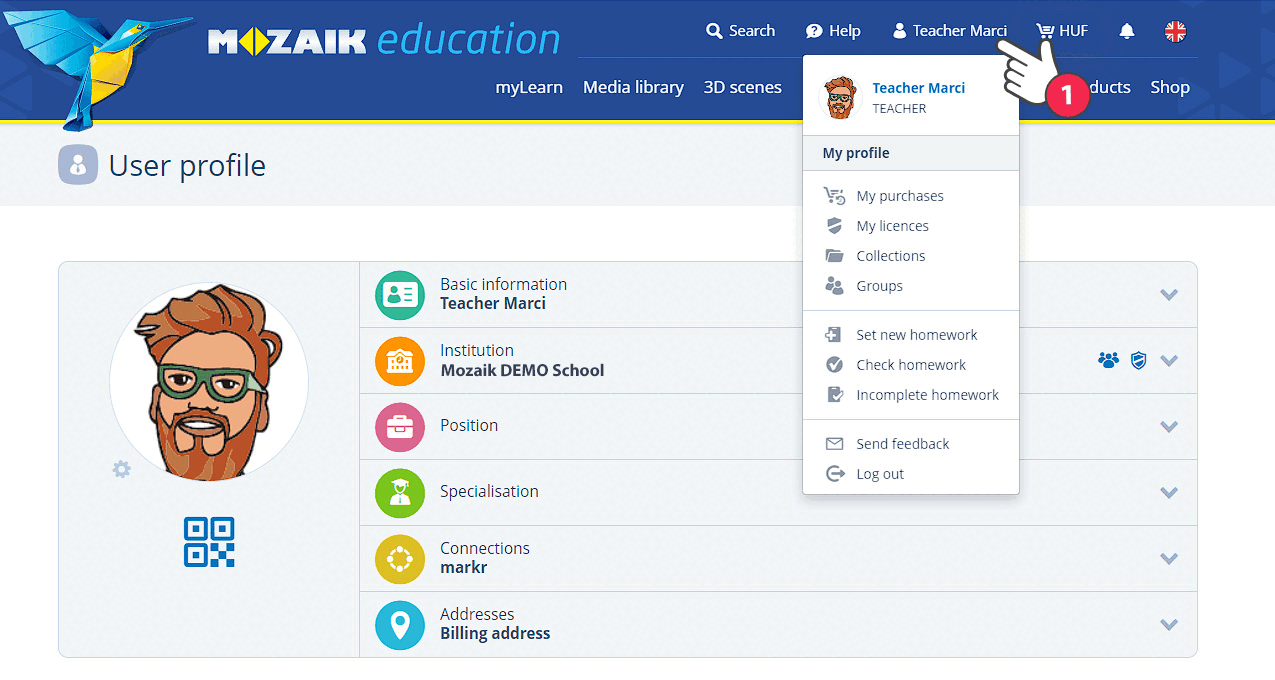 On a mobile device, click on the menu button in the top left corner, then the green figure to display the menu where you can find the My profile menu item.