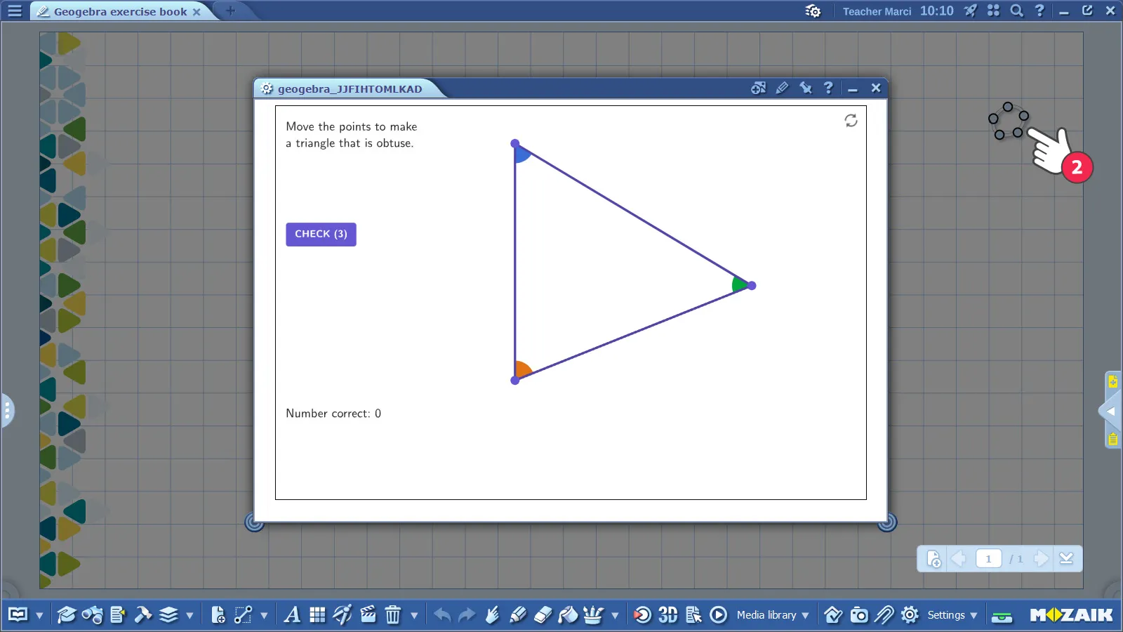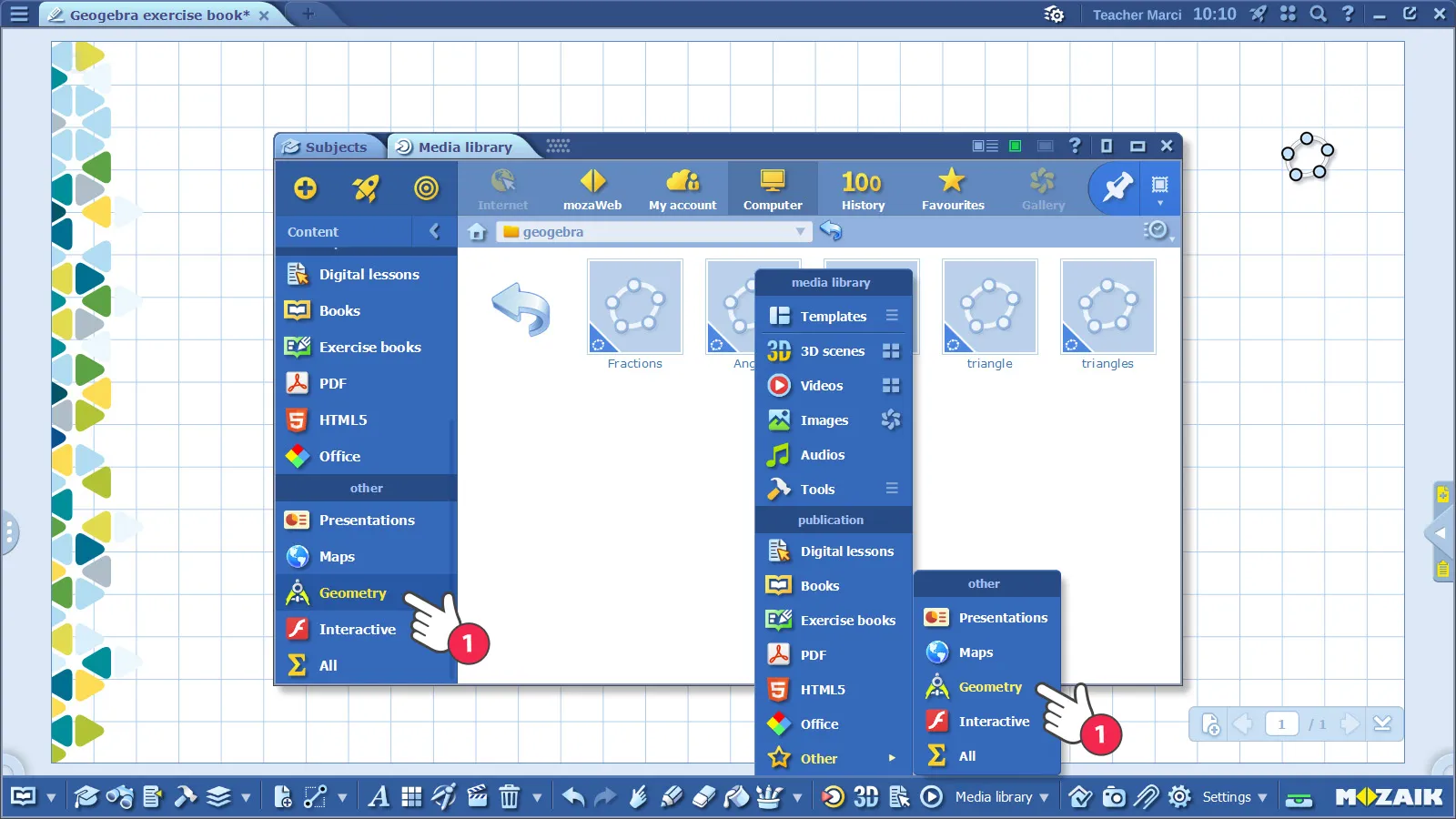 Los contenidos de GeoGebra se pueden abrir en mozaBook. La extensión de los archivos de GeoGebra es .ggb. Puedes encontrar estos archivos en la Mediateca, eligiendo el menú Geometría (1).