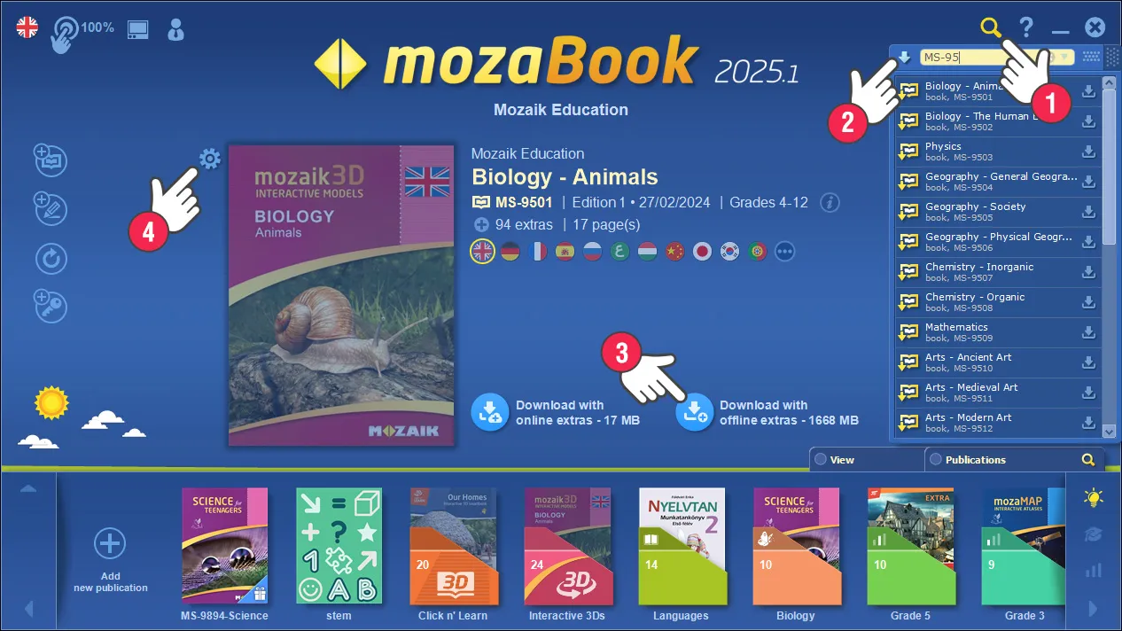 On the main page of mozaBook, click on the magnifier (1) icon near the top right corner of the screen, type in "MS-95", then click on the arrow (2) to view the search results below. Select and download the offline version of the books (3) matching your subject (Physics, Biology, etc).