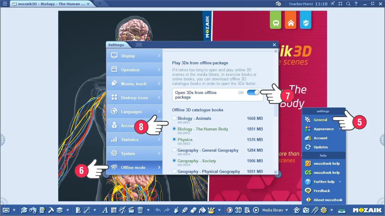 Open a publication and select Settings => General (5) from the menu. In the pop-up window, select Offline mode (6), scroll to the option Open 3Ds from offline package and turn it on (7). Here, you can also see which offline packages are already downloaded to your computer. You have the option to mark (8) further books to download or you can also delete them in order to free up storage space.