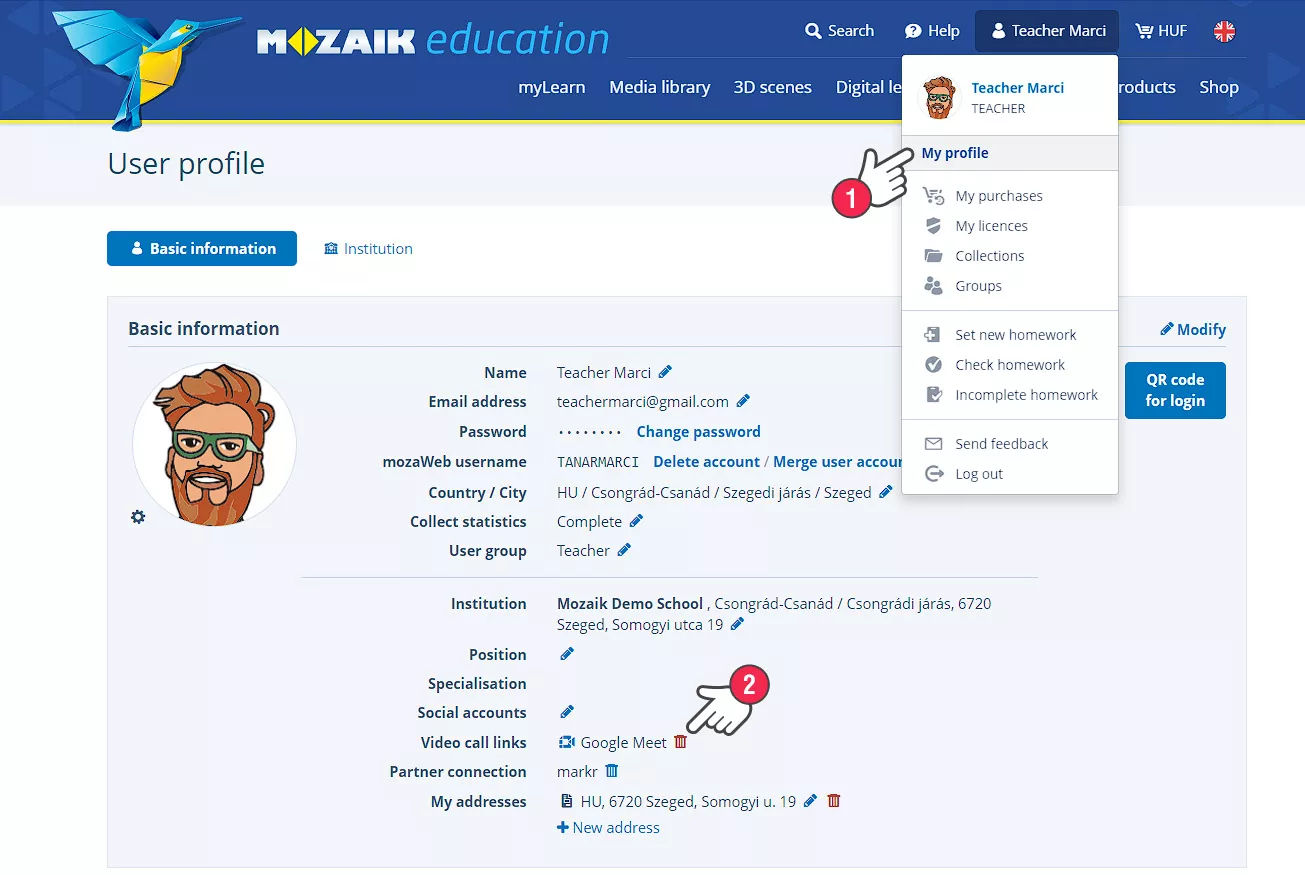 Със навидеоконференцията към mozaWeb профила ви ще бъде добавен акаунтът, с който сте влезли в услугата за видеоконференцията. Ако желаете да прекратите свързването с услугата и да се свържете с акаунт за друг провайдър за видеоконференции (например да се свържете чрез профил, с който имате абонамент), тогава в моя профил (1) кликнете върху иконата кошче в реда връзка за видеоконференция (2)! В този случай при започване на следващата видеоконференция отново трябва да влезете в избрания провайдър. (Редът за връзки с видеоконференции се появява, само ако имате свързан профил с някоя от услугите за видеоконференции  .)