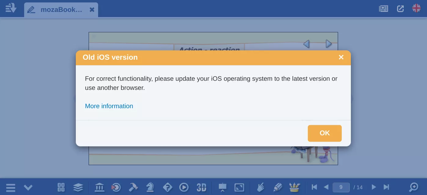 ข้อผิดพลาดนี้มีอยู่ในระบบปฏิบัติการที่เก่ากว่า iOS 17 และเฉพาะใน เบราว์เซอร์ Safari เท่านั้น เพื่อหลีกเลี่ยงข้อผิดพลาดนี้ ให้อัปเดตระบบปฏิบัติการของคุณหรือใช้ mozaWeb ในเบราว์เซอร์อื่น (Chrome, Firefox, Edge, Opera...)