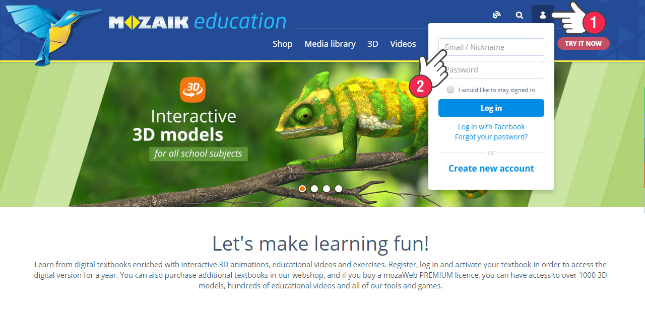 Open het inlogpaneel (1) in de header van de pagina en vul je e-mailadres en wachtwoord in, die je hebt gebruikt voor het aanmaken van je account. In plaats van je e-mailadres (2) kun je ook inloggen met een social-media-account (Facebook, Google, Microsoft, VKontakte)