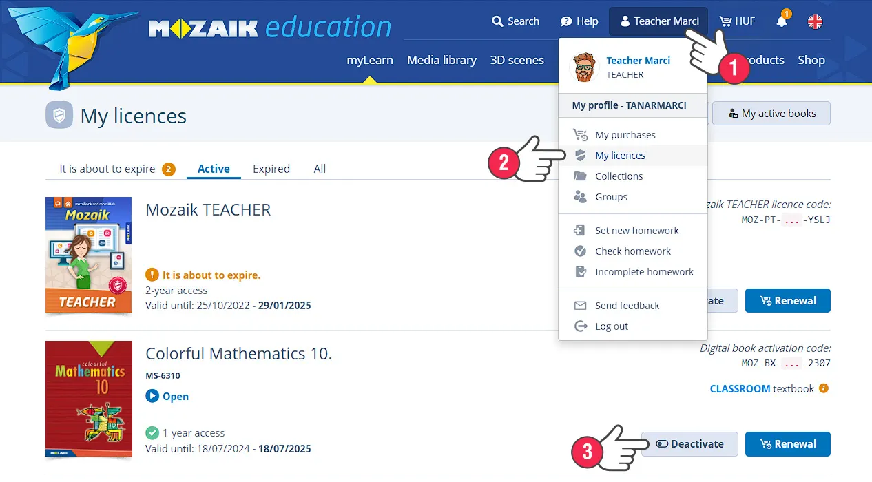 يمكن إلغاء تفعيل التراخيص المرتبطة بحسابات المستخدمين خلال أسبوع من التفعيل. وتشمل هذه التراخيص Mozaik TEACHER / Mozaik STUDENT بالإضافة إلى تراخيص الكتب الرقمية والأطالس الرقمية.