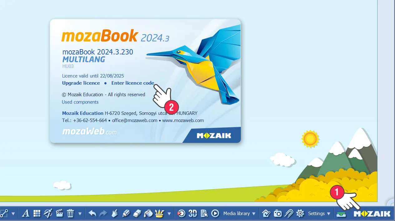 Después de iniciar sesión en mozaBook, haz clic en el logotipo Mozaik (1) en la barra de herramientas y elige la opción Introducir código de licencia (2) en la caja de información que aparece.