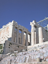 - Propylées - Portail typique de l'Antiquité grecque. Dans le cas d'Acropole, il est composé de deux vestibules et de cinq passages.