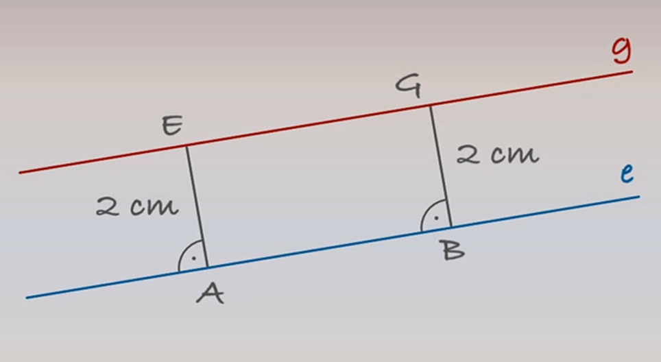 Dan je pravac 'e'. Nacrtajmo pravac usporedan s pravcem 'e' i udaljen od njega 2 cm.