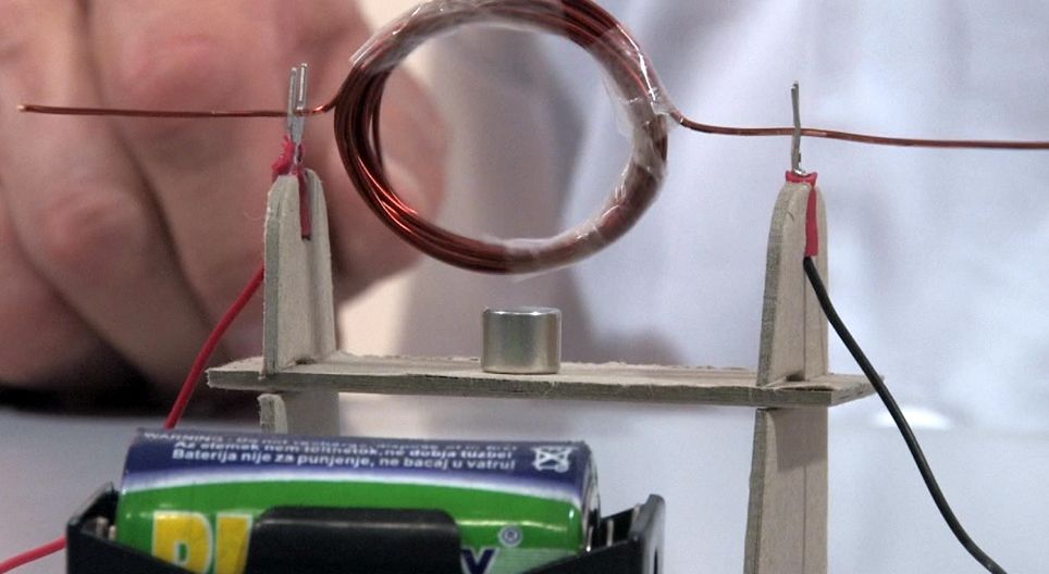 Tekercs forgatása mágnessel és 1,5 voltos elemmel.