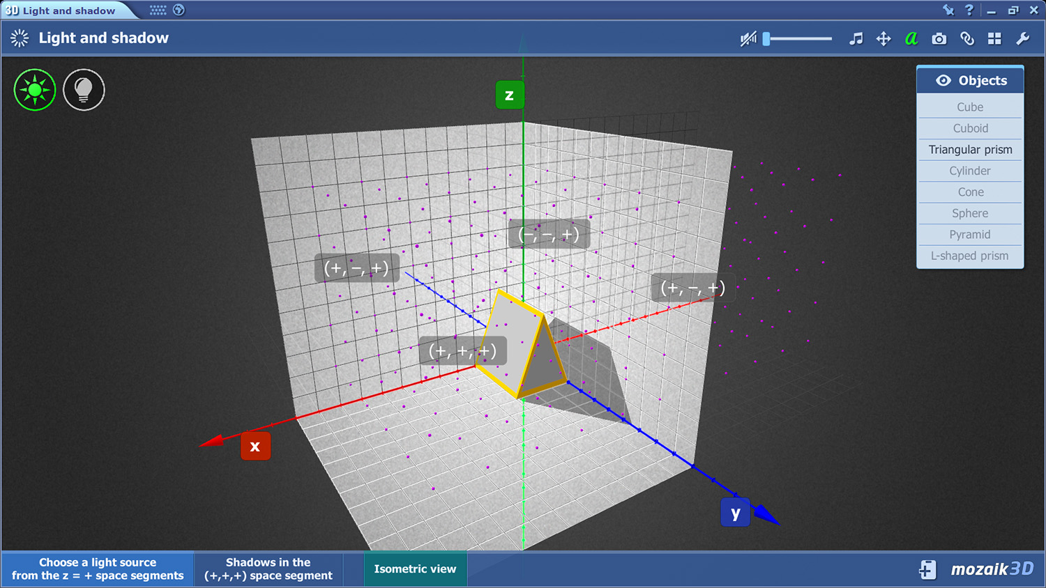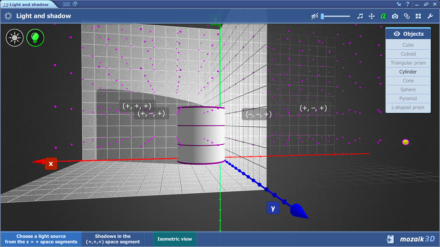 In another model, Light and shadow (below), the user can experiment by placing a light source near different spatial shapes in a room which is actually a 3D coordinate system. Depending on the type of light source, its placement and its distance from the shape, the shadow cast will differ dramatically. There are 8 different objects and two types of light to choose from in the coordinate system and the ability to rotate the 3D model and view the objects and shadows from different perspectives provides a great demonstration for students of art and physics alike.
