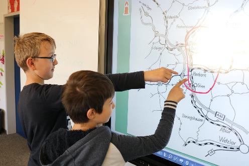 Im Geografie-Unterricht des vierten Schuljahres konnte altes Kartenmaterial des Landkreises digitalisiert werden. Auf diese Weise war es möglich den Schülern auf der Tafel übersichtlich die Grundlagen der Topographie näher zu bringen. Die Kinder präsentierten ihre Entdeckungen zu Flüssen, Städten, Dörfern und Gebirgen, zeichneten diese ein und beschrifteten.