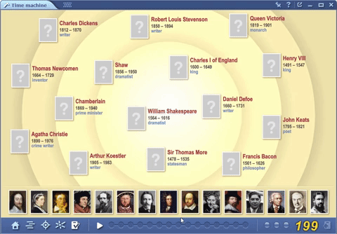 The good news is that there is a whole variety of ways to expand your knowledge in the subject of history outside of the classroom, such as visiting museums, historical buildings, going on a sightseeing tour or talking to your grandparents to learn more about local and contemporary history.Besides that, we can offer the Time Machine tool which is basically an interactive timeline where you can search for any historical individual and put them in the center of a diagram. Around the selected person a whole bunch of similarly significant people will appear, but you have the option to manage the results as the profession, nationality, or time period can be also set.Once you have the whole crew on your plate (for example, William Shakespeare with his contemporaries and fellow writers), you can generate an exercise with one click . The goal is to match the names with the images on the tray which is an exceptionally good way to refresh the memories about important historical dates and figures.