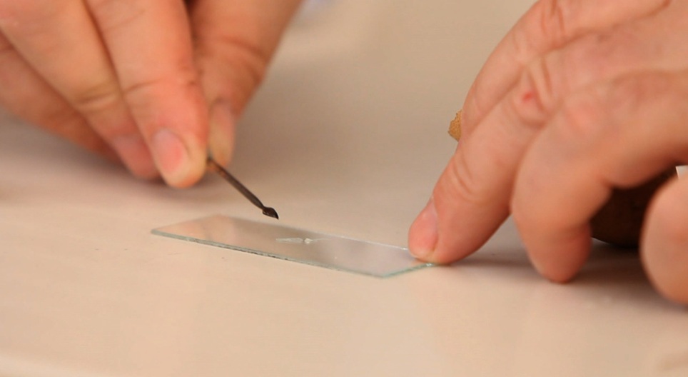 광학 현미경을 통해서 루골액으로 덮은 녹말을 관찰합니다.