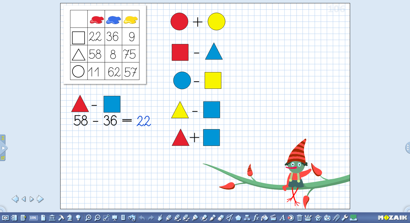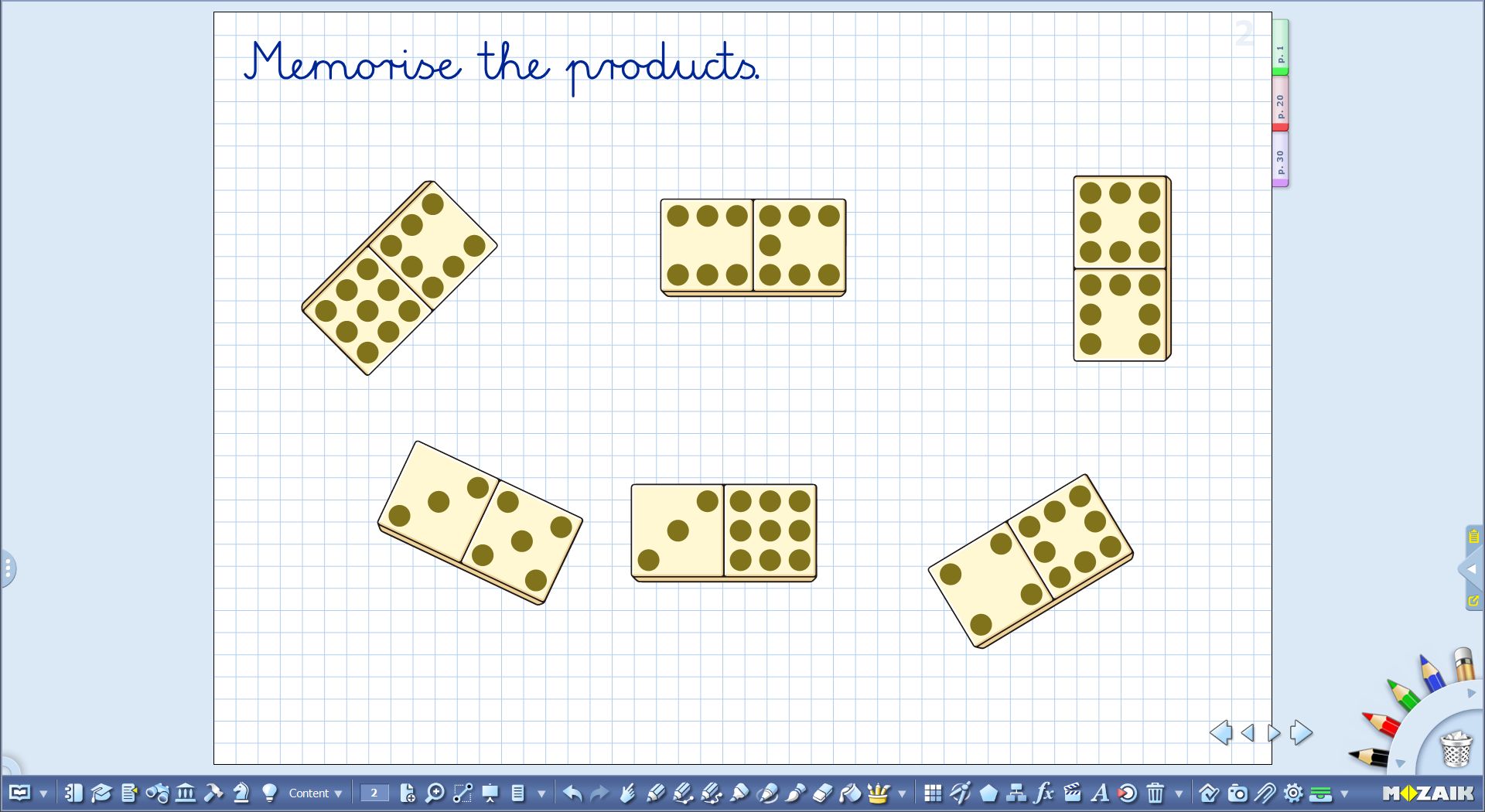 With the help of mozaTools, you can create many different types of exercises to practice mental calculation, which help to develop attention skills and visual perception at the same time. It helps with solving the exercise if operations are animated. See images below to have more ideas of how you can use mozaBook to help your students develop memory and attention skills.