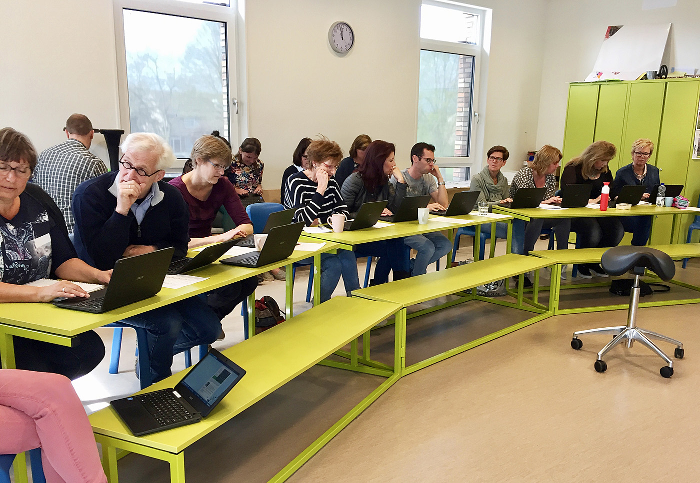 Most schools also order a training package from a Dutch mozaBook wizard, Niek Scholts (Bureau Loren), who developed an engaging and informative training programme in Dutch. The enthusiastic teachers on the pictures are from the Sterrenboom school in Stolwijk, and recently had their week of training with Niek. You can see them working on student laptops during the “digital classroom” session. Next year the Sterrenboom school will join the league of official mozaBook schools and will start spreading the joy of digital education.