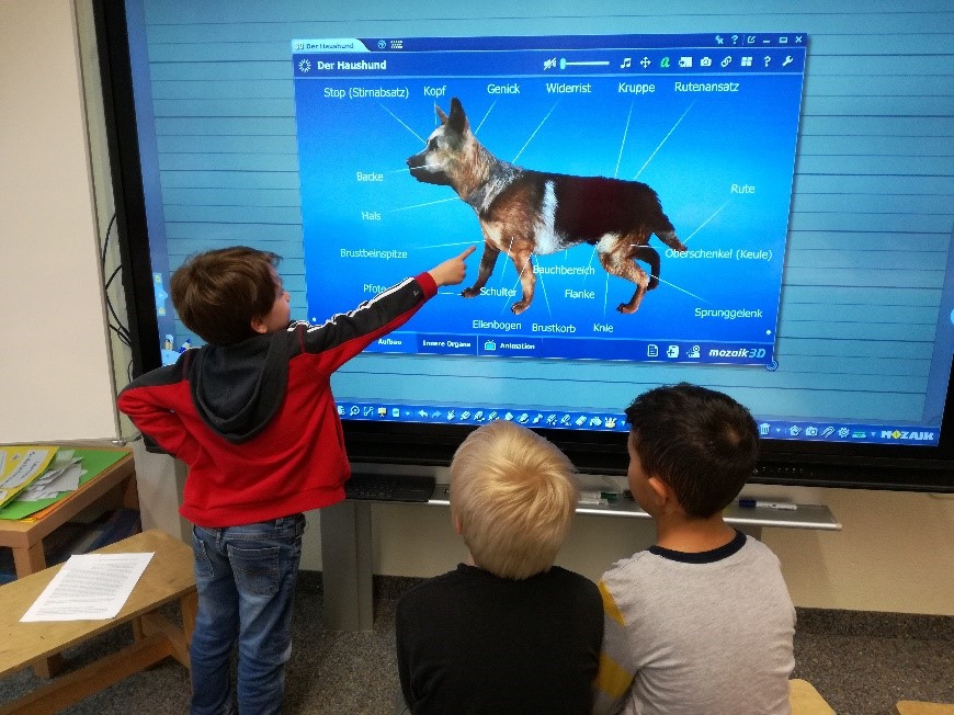 Im zweiten Schuljahr fand eine Unterrichtseinheit zum Thema Haustiere statt. Eine Gruppe beschäftigte sich dabei mit dem Hund und konnte anhand des 3D-Modells die Körperteile und äußeren Organe kennen- und bestimmen lernen.