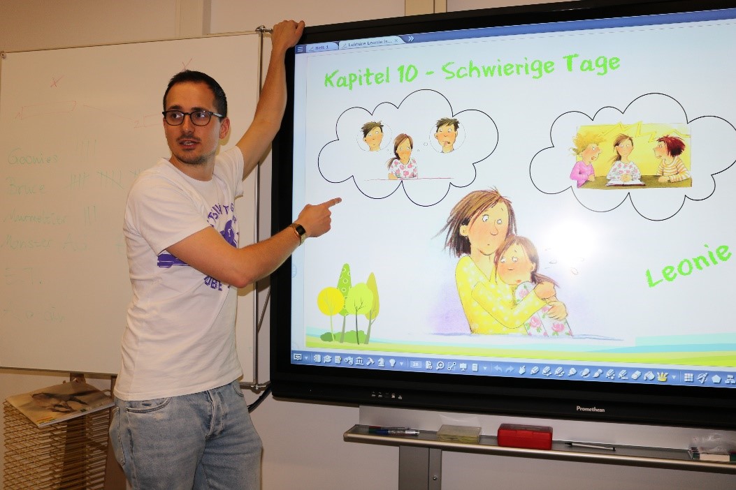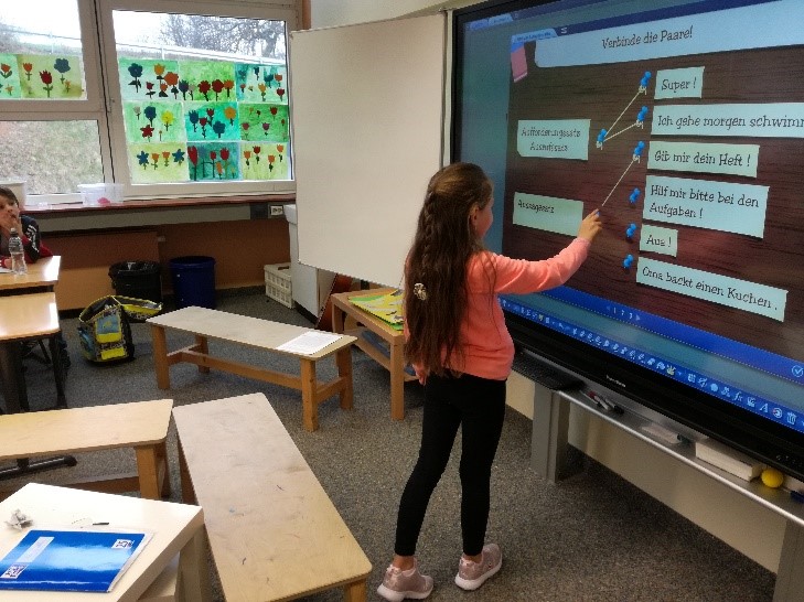 Im vierten Schuljahr lesen die Kinder aktuell einen Kinderroman zum Thema „Verliebtsein“. Einzelne Bilder des Romans wurden digitalisiert, um diese mit den Schülern besprechen zu können und das Leseverständnis zu überprüfen. Dies motivierte die Schüler beim Lesen und förderte die mündliche Kommunikation. Außerdem erarbeiteten die Kinder ein Lesetagebuch. Die verschiedenen Aufgaben zu den einzelnen Kapiteln wurden in Tabellenform an der Tafel präsentiert, sodass jedes Kind zu jeder Zeit eine Übersicht zur Verfügung hat.Um im Deutschunterricht des zweiten Schuljahres die unterschiedlichen Satzarten abzufragen, wurden mit Hilfe des Testeditors verschiedene Aufgabenformate entwickelt. So konnte die Lehrerin am Ende der Einheit feststellen, ob alle Unterrichtsinhalte von den Schülern erworben wurden.