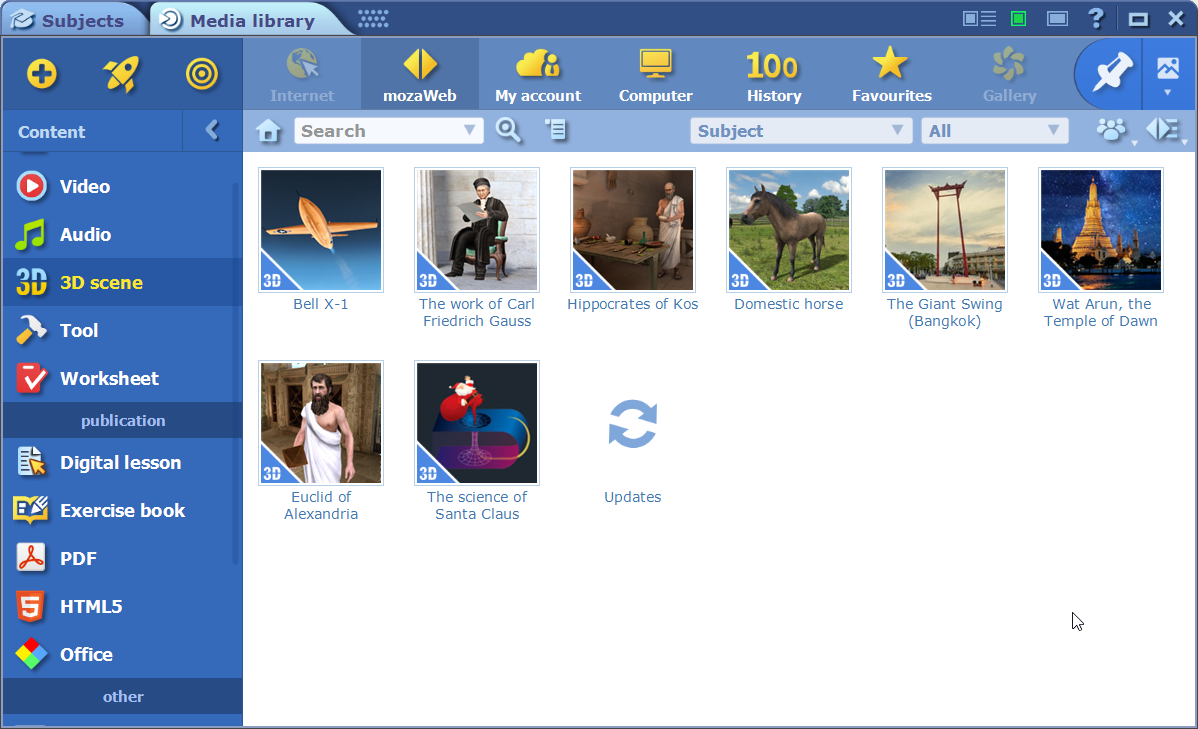 • We have introduced a new intelligent view for the publication menu. Users are now able to access instantly the most recently opened publications and exercise books. Furthermore, publications can be categorized by subject, grade, publication type, publisher, series, and age group.  Users can filter for primary aspects straight from the book self and then further categorise in the view menu for secondary attributes to form folders. They can quickly and intuitively find the desired content by selecting primary and secondary attributes (for example they can group first for subject and then further organize for publisher) with the mini-icons next to the book-shelf at the same time. With this method, as shown in the picture below, users can easily group books and atlases belonging to the subject of history.