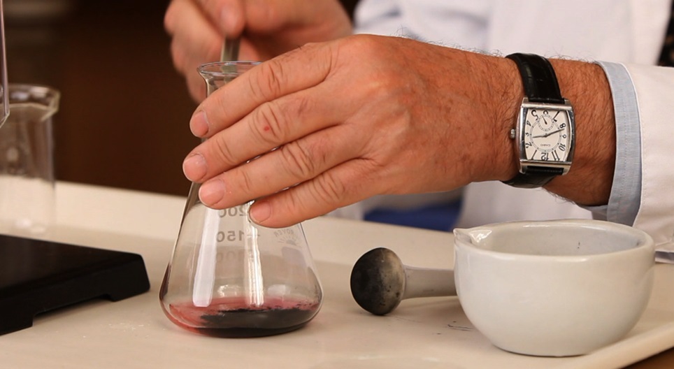 Het zuiveren van een oplossing die gekleurd is met fuchsine kleurstof, met fijngemalen actieve koolstof korrels en een filter.